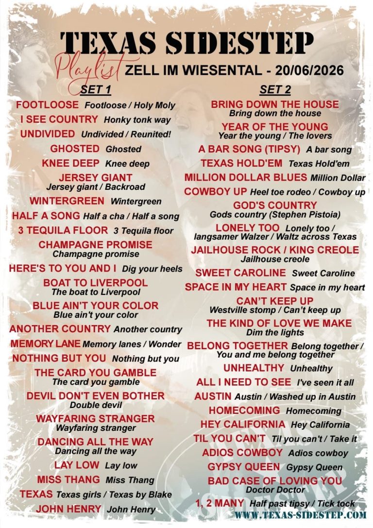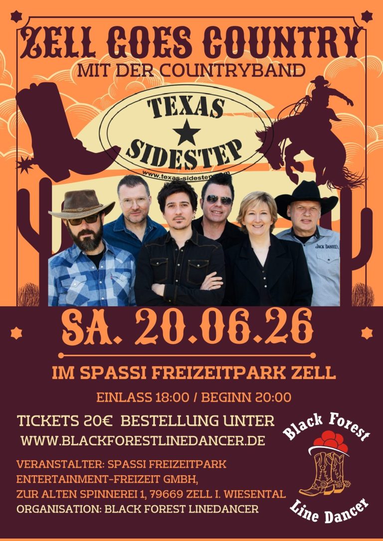 Erlebt am 20. Juni 2026 eine unvergessliche Country‑Night im Spassi in Zell im Wiesental – mitreißend, authentisch und voller Tanzfreude. Highlight des Abends ist Texas Sidestep, eine der beliebtesten Country‑Bands Europas. Line‑Dancer und Country‑Fans dürfen sich auf einen besonderen Abend voller Musik, Emotion und echter Western‑Atmosphäre freuen.